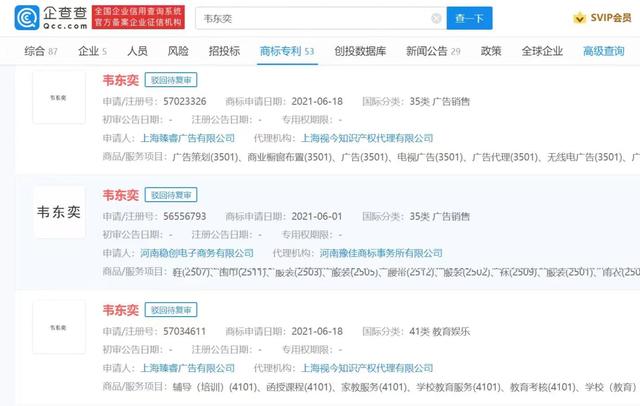 根据查询发现,河南稳创电子商务有限公司曾于2021年6月1日申请注册“韦东奕”商标,目前进度为“驳回待复核”。而该公司在申请被驳回后并没有放弃,又再次提交申请,目前还是尚未通过状态。