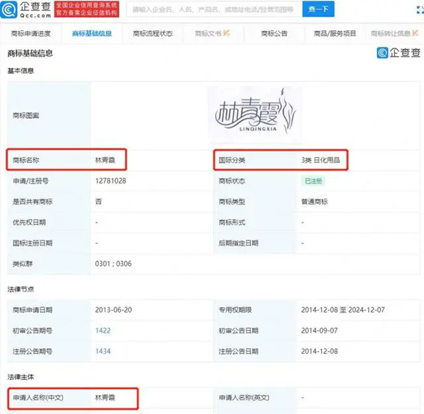 目前“林青霞”已被注册成商标,申请人为林青霞,注册号12781028 ,国际分类为3类日化用品,服务项目包括洗发液、化妆品、防晒剂等。
