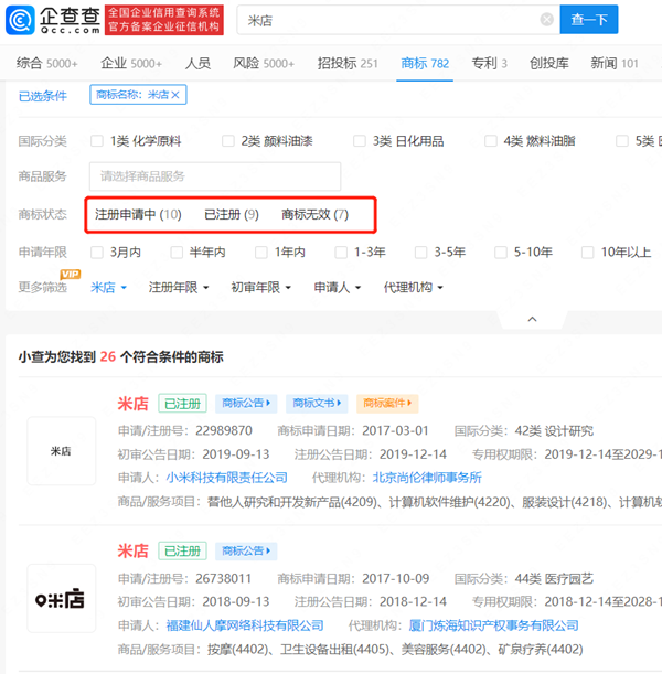 根据搜索得知,“米店”已被多方申请注册商标,申请人包括小米科技有限责任公司在内的多家网络科技、投资管理、电子商务公司,国际分类涉及地毯席垫、医疗器械、广告销售等,当前商标状态多为已注册。